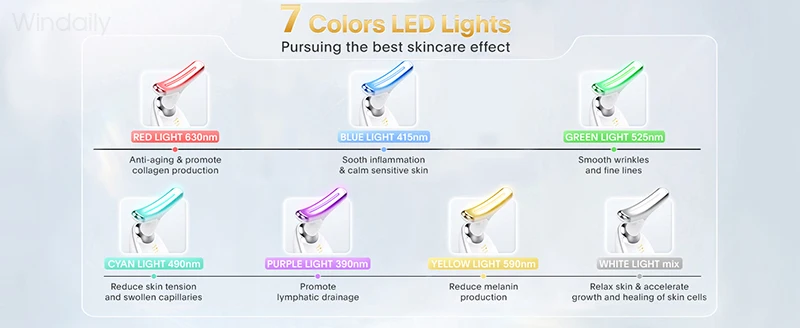 2.Terapia de luz LED de 7 cores de vermelho, azul, verde, roxo, amarelo, ciano, branco com três níveis de ajuste de intensidade, pode efetivamente ativar a pele, reparar a elasticidade da pele, melhorar a flacidez da pele e reduzir linhas finas e rugas.